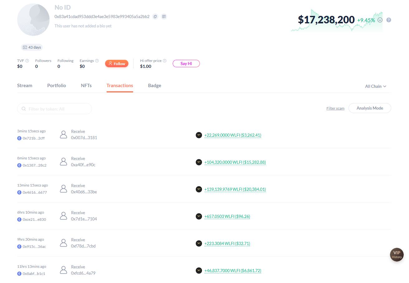 从DeBank的链上记录可以看到,这条鲸鱼地址在过去14小时内持续买入并累计持有约1.16亿枚WLFI,按现价约合1702万美元。这样的行为在加密市场里极具指标意义——它通常意味着大资金开始布局中长期头寸。更重要的是,这次吸筹发生在WLFI价格经历短暂震荡、市场情绪偏谨慎的阶段,说明该资金主体对项目有较高的中长期信心。鲸鱼往往代表机构或深度内部人士,其资金体量与信息来源均远超普通投资者,因此这种连续买入行为,往往是趋势逆转的早期信号。