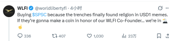 受WLFI创始人启发的无厘头Meme币SPSC在获WLFI官方背书后暴涨130%